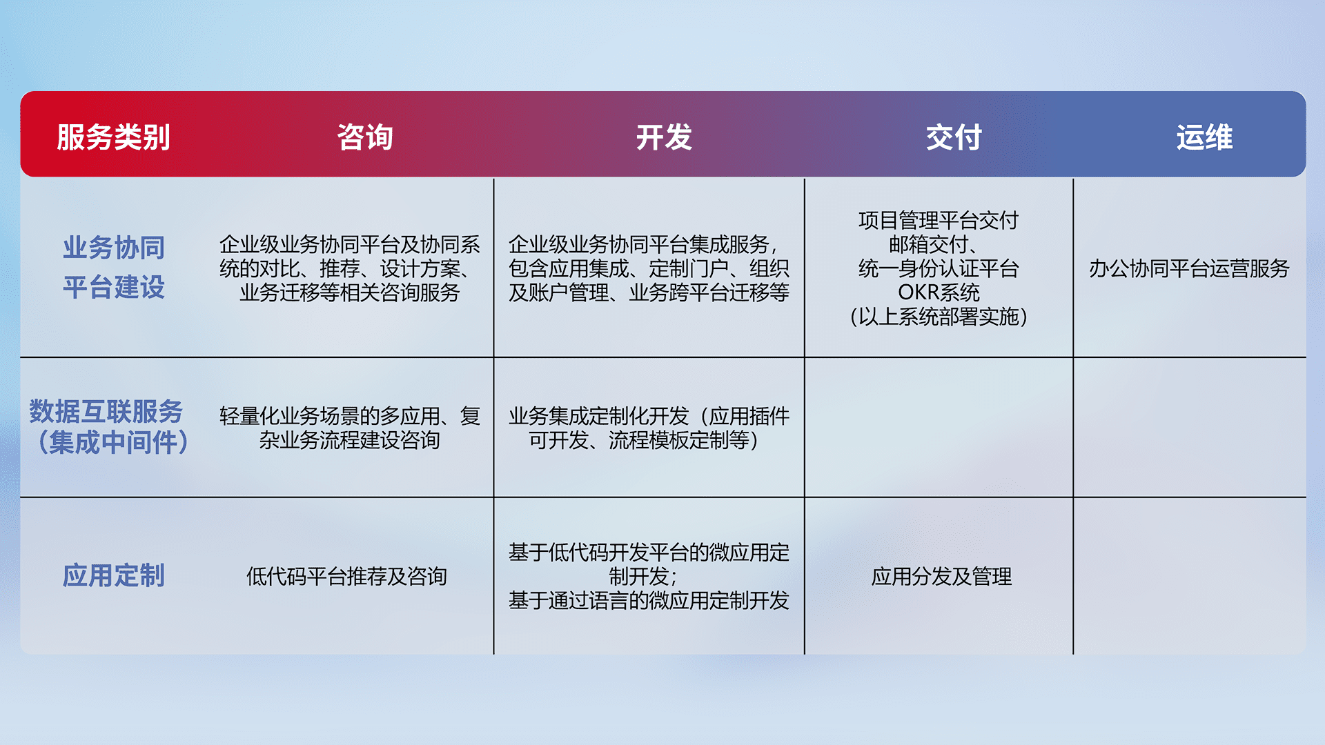 针对钉钉、、、企微、、IDaas等平台级产品提供产品的规划、、、、方案、、、、交付、、定制化开发等服务,,实现如统一协同办公、、、、智能客户服务、、混合会议管理、、、智能数据查询、、、等业务场景,,,,实现数字化转型。。